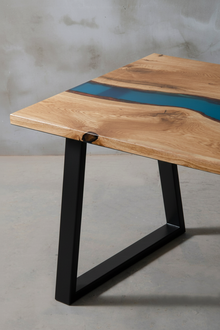 Erliegen Sie dem Charme unseres Wabi River Tisches mit trapezförmigem Fuß. Die Kombination aus Ulme und farbigem Harz macht ihn zu einem wahren Kunstwerk. Dieser außergewöhnliche Tisch passt in jedes Interieur, sei es in Ihrem Esszimmer oder im Herzen Ihres Restaurants.