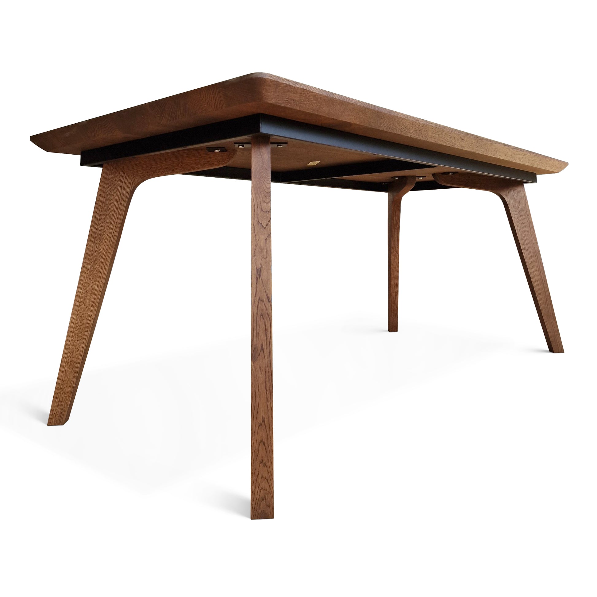 Handcrafted extendable dark oak table 180×90 cm from the Aurora Collection. Made from solid oak planks (30 mm thick) with a rich chocolate oil finish, this elegant 6–8 seater table features a sturdy metal base for exceptional strength and durability. The wood is FSC Recycled 100% certified and free from chemicals.