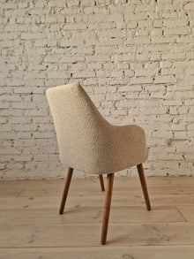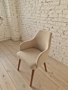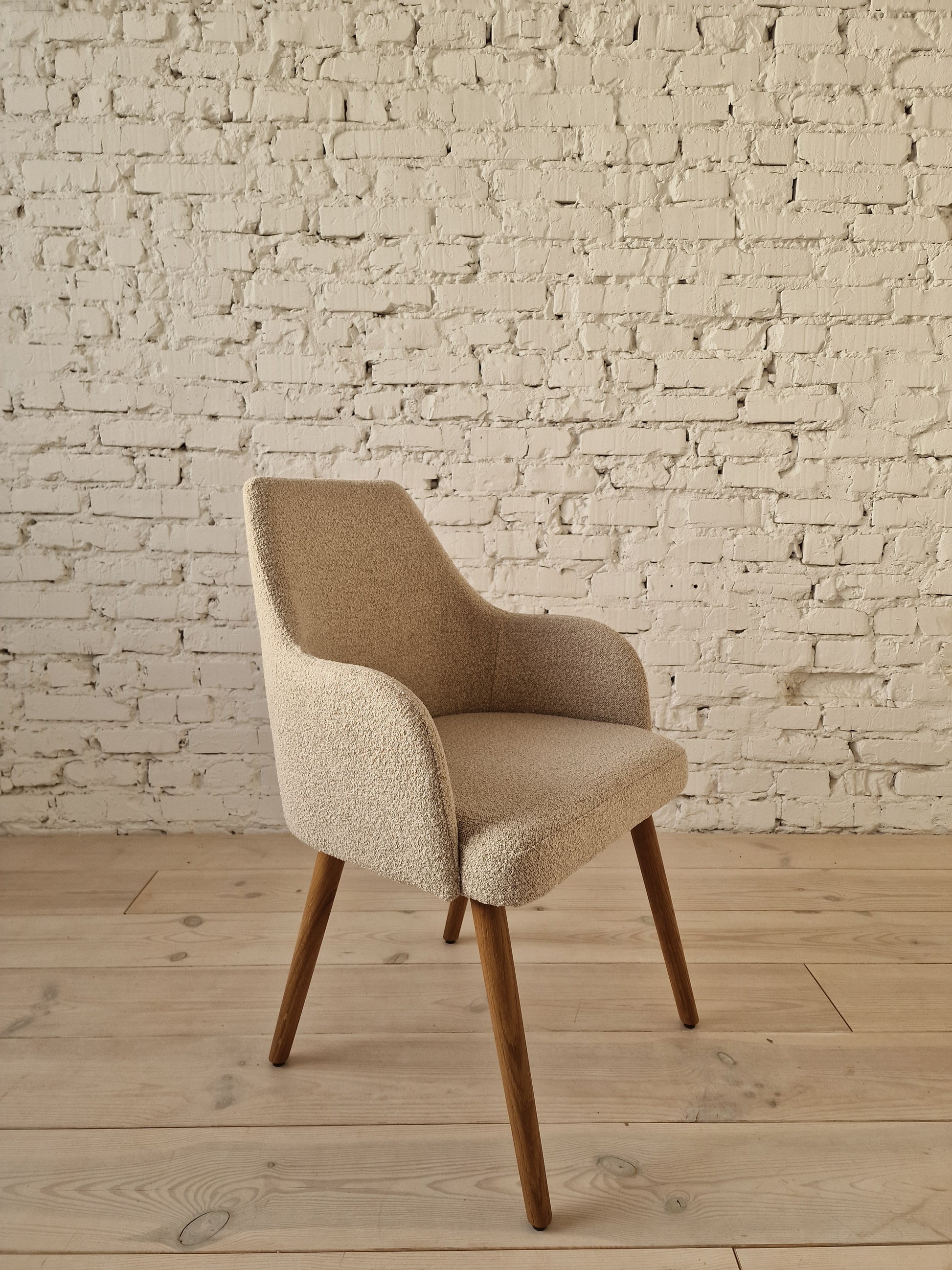 The Celeste Armchair combines sculptural lines with soft curves, offering a refined yet welcoming seat for dining, working, or relaxing. Its high back and gently flared arms provide comfort and support, while the sleek, tapered wooden legs add a timeless finish.