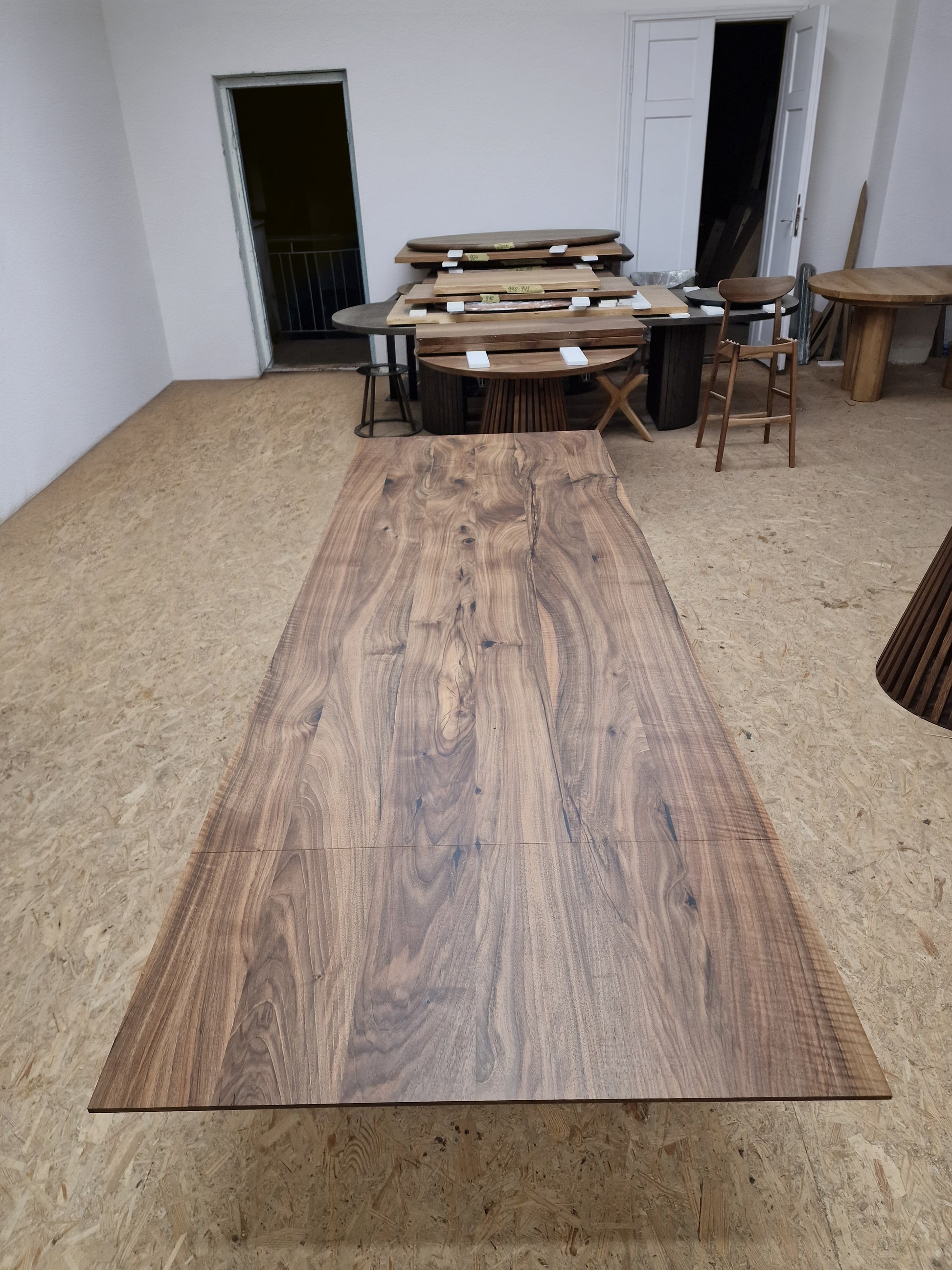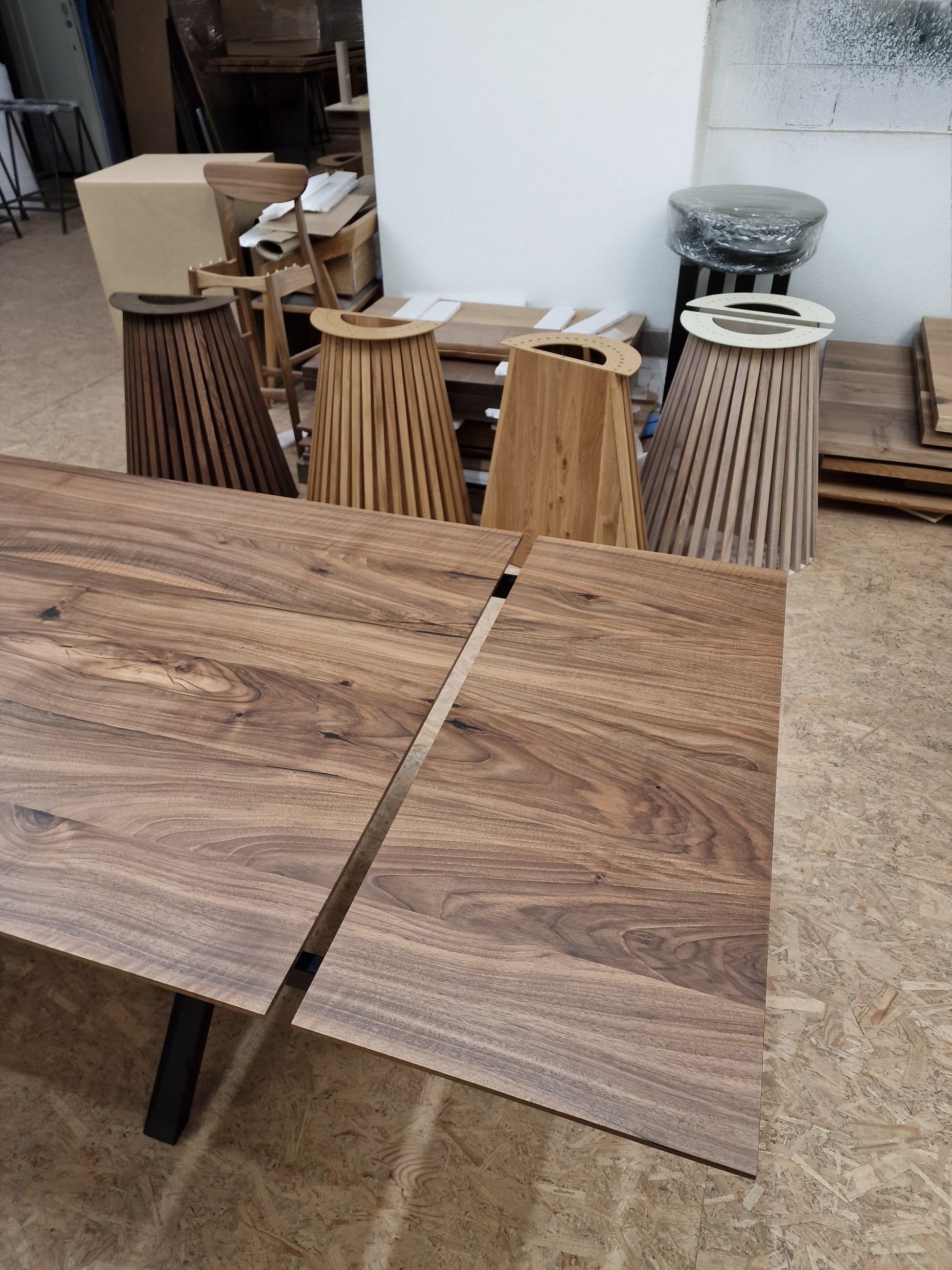 All our extension panels are made of solid planks and come from the same tree as the main table. Extended table has one uninterrupted beautiful grain.